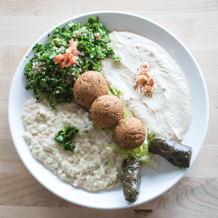 Includes hummus, baba ghanoush, tabbouleh, falafel, grape leaves, and pita bread. ($16.83 / person) serves 12