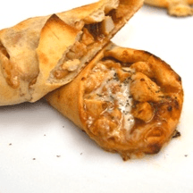 Buffalo chicken with melted cheese wrapped in a soft roll, topped with a sprinkle of herbs. served with buffalo ranch.