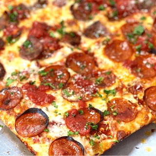 Bold pepperoni with bright red sauce and mozzarella layered over that golden‑fried square crust, finished with fresh basil for aromatic balance.