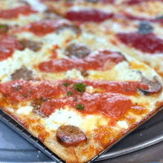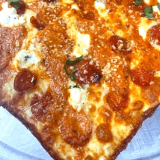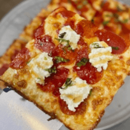 House-crafted vodka cream sauce, Italian sausage, creamy ricotta, mozzarella, pecorino, and basil on a crisp square base.