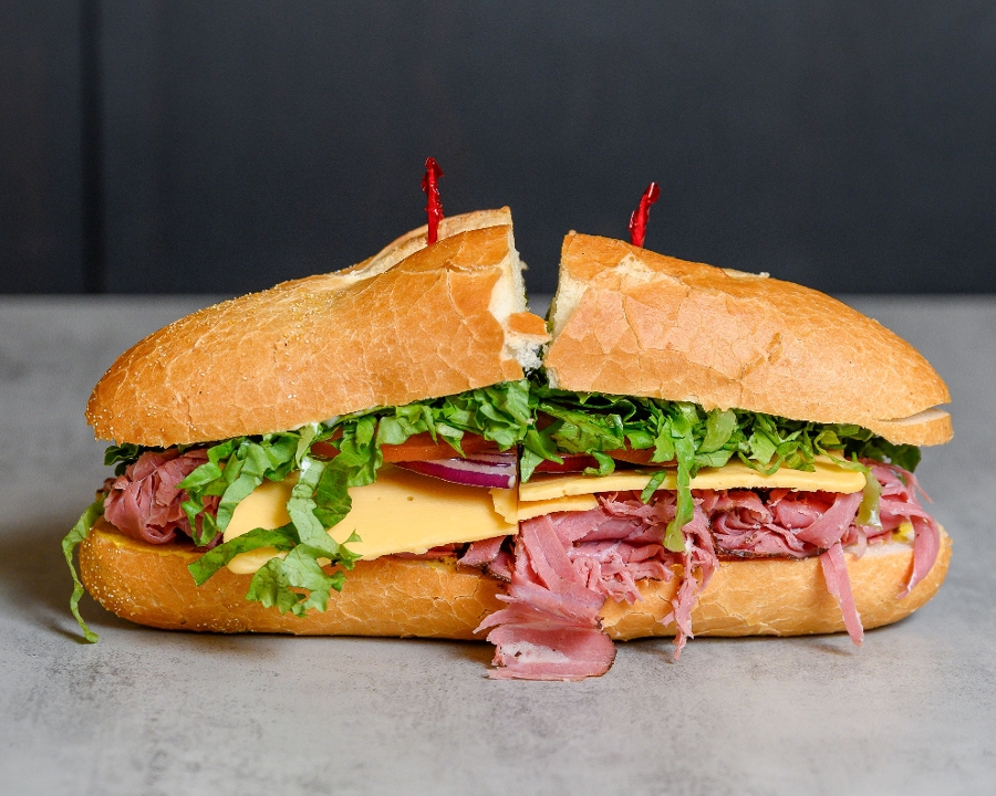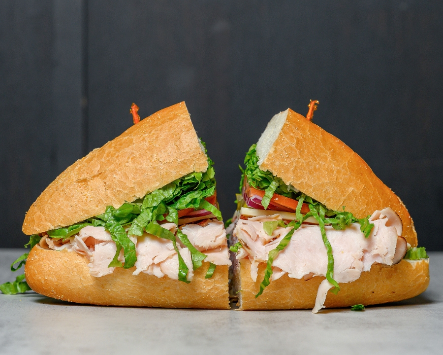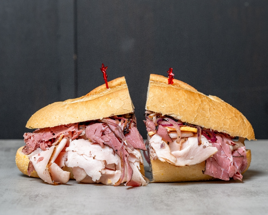 1st Cut Pastrami & Honey Maple Glazed Turkey with 3 Layers of melted Yellow American Cheese & red onions on a toasted french roll with mayo