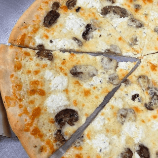 No red sauce—just garlic-infused olive oil with mozzarella, ricotta, pecorino, and sautéed mushrooms for elegant simplicity.