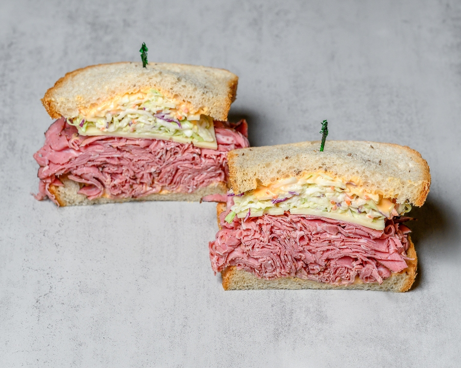 1st cut pastrami brisket or top round corned beef with Swiss cheese, Cole Slaw and 1000 Island dressing on rye bread.