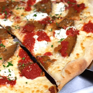 Similar to the square version, round pie features Italian sausage with creamy vodka sauce, ricotta, mozzarella, pecorino, and basil.