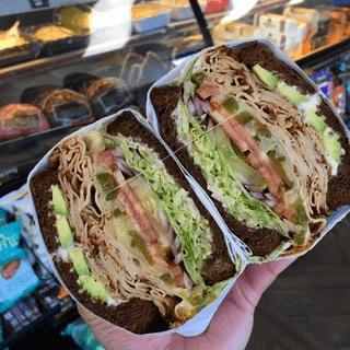 Maple glazed honey turkey, Pepper Jack cheese on squaw with lettuce, tomato, onion, pickle, mayonnaise and honey mustard. Avocado Additional.