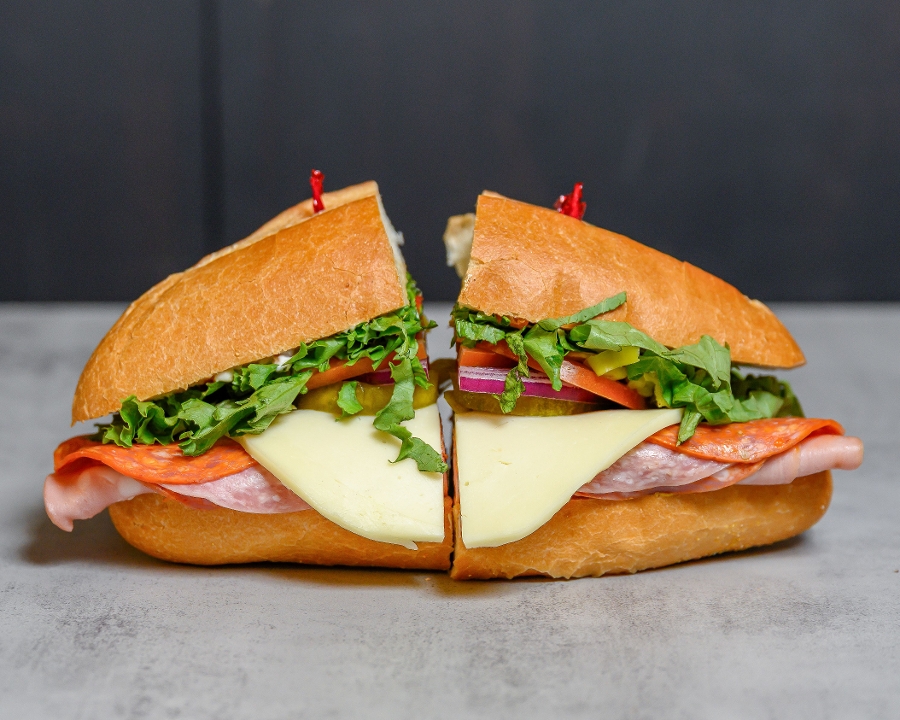 Mortadella, hot butt cappi, sandwich style pepperoni, Genoa salami and Provolone cheese with lettuce, tomato, onion, pickle, pepperoncini, roasted red peppers, mustard, mayo and Italian dressing on a Hero.