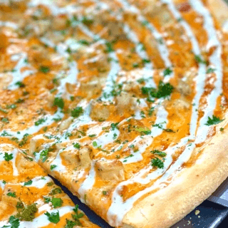Spicy buffalo chicken, extra sauce, and melty mozzarella—topped with house ranch drizzle for classic buffalo flavor in round form.
