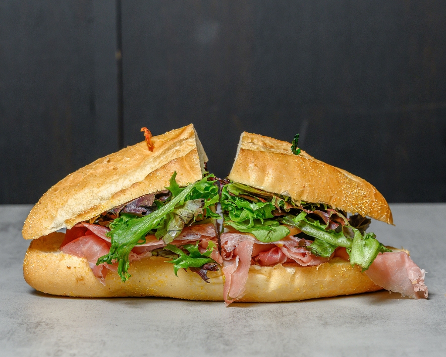 Arugula topped with ham, Ovengold turkey, provolone cheese, tomato, onion, cucumber, pepperoncini, avocado and baked parmesan croutons.