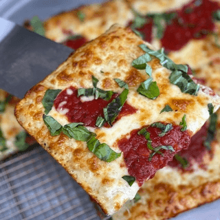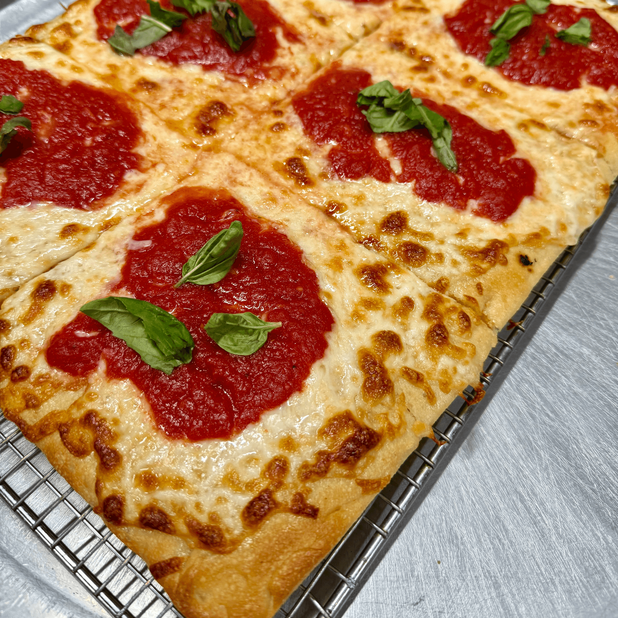 A crisp‑edged square olive‑oil crust topped with pillowy mozzarella, bright crushed tomato sauce, and fresh basil—a classic, simply satisfying pie.