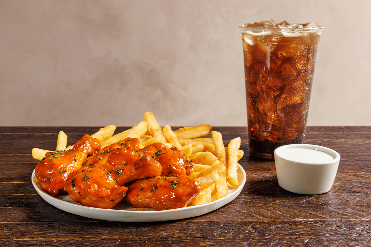 Includes regular fries and a fountain beverage. Choice of housemade sauce + dipping sauce.